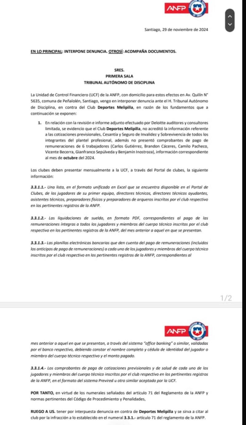 “En relación con la revisión e informe adjunto efectuado por Deloitte auditores y consultores limitada, se evidenció que el Club Deportes Melipilla no acreditó información referente a las cotizaciones previsionales, Cesantía y Seguro de Invalidez y sobrevivencia de todos los integrantes del plantel profesional. Además, no se presentó comprobante de pago de remuneración de seis trabajadores (Carlos Gutiérrez, Brandon Cáceres, Camilo Pacheco, Vicente Becerra, Gianfranco Sepúlveda y Benjamín Inostroza), información correspondiente al mes de octubre de 2024″, consigna la presentación a la que accedió El Deportivo.