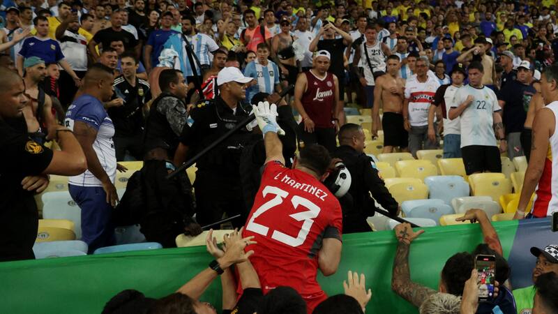 Durante esos minutos de incertidumbre, se viralizan por redes sociales numerosos videos de los graves acontecimientos en Río de Janeiro. Sin embargo, uno de esos registros rápidamente comienza a dar la vuelta al mundo: Emiliano “Dibu” Martínez, arquero de Argentina, se enfrenta directamente con la fuerza de seguridad del recinto.