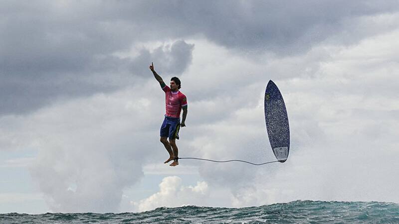En la captura, el surfista y su tabla parecen mantenerse en el aire sobre el mar, mientras el atleta celebra su notable actuación. De esta forma, el tricampeón del mundo en esta disciplina ganó su prueba con la mejor puntuación (9,9/10), algo jamás logrado en los Juegos y, de paso, se llevó su medalla de Bronce.