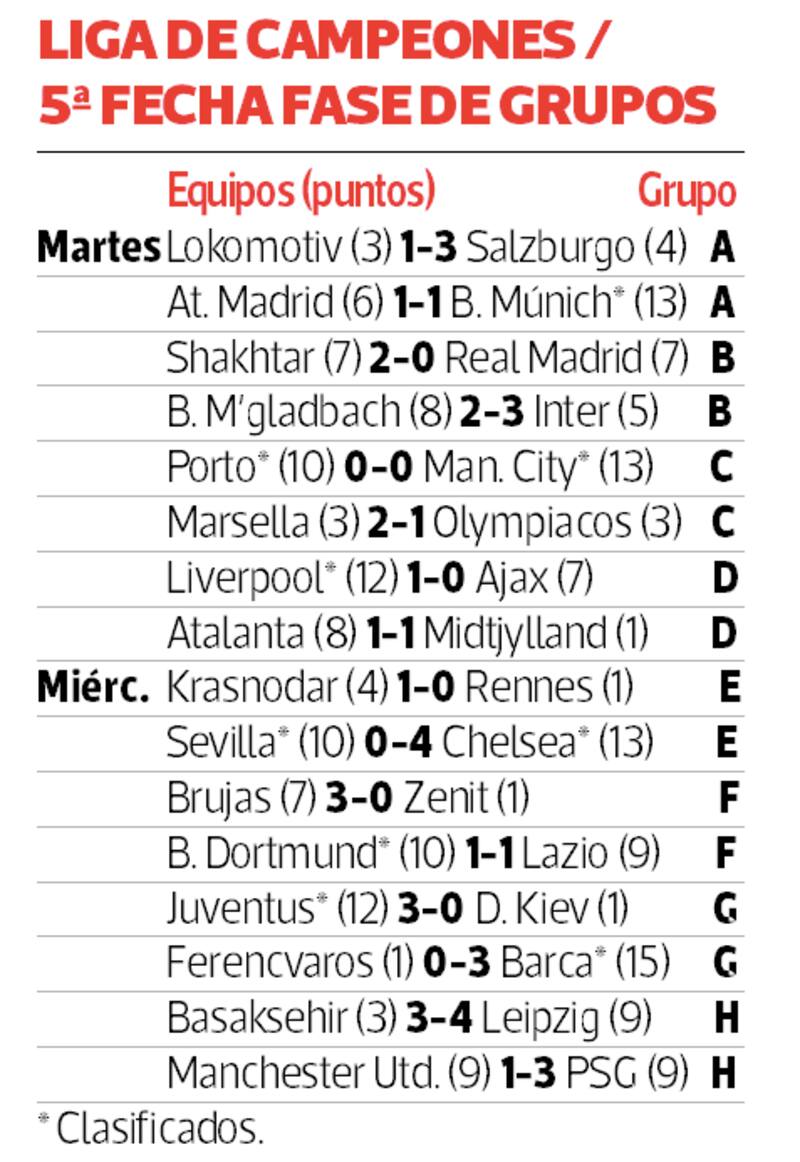 En tanto, se sumó a la lista de clasificados Borussia Dortmund, pese a no pasar del empate 1-1 en casa ante Lazio, que en la última jornada recibirá al Brujas por el otro boleto del Grupo F.