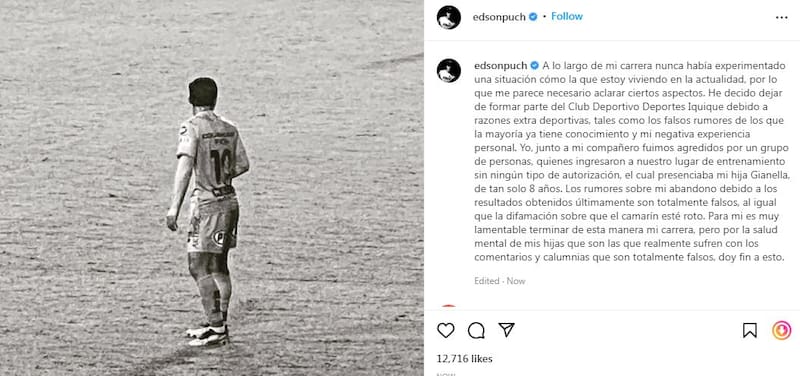 Mediante un mensaje en su cuenta de Instagram, Edson Puch dio a conocer el fin de su carrera deportiva. El futbolista no estaba atravesando por el mejor momento en Deportes Iquique, lo que permitió una serie de elucubraciones respecto a su futuro en la tienda celeste. Salió al paso de aquello para aclarar las cosas y explicó las razones del por qué no sigue en los Dragones Celestes, poniendo punto final a su trayectoria como futbolista.