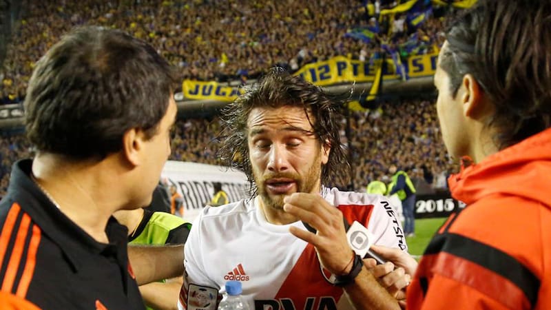 Los jugadores de River fueron rociados con gas pimienta en la manga que los llevaba a la cancha por barrista de Boca y Leonardo Ponzio, Leonel Vangioni, Ramiro Funes Mori, Sebastián Driussi y Matías Kranevitter fueron los más afectados con quemaduras en sus ojos y piel.