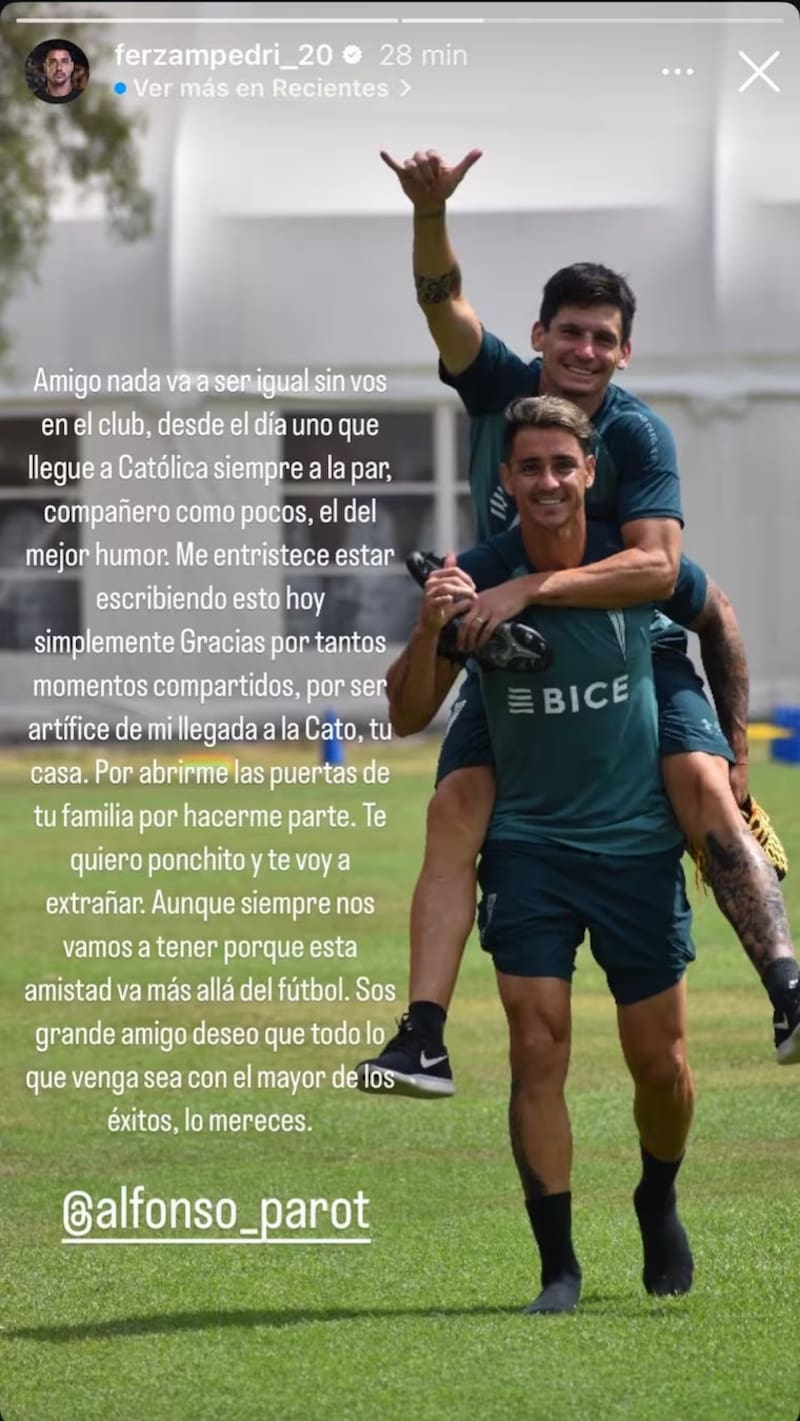 La situación del lateral ha generado diversas reacciones. Una de las más emotivas vino por parte de Fernando Zampedri. El goleador histórico de Universidad Católica eleva el valor que tuvo el carrilero en su arribo al club. “Amigo, nada va a ser igual sin vos en el club, desde el día uno que llegué a Católica siempre a la par, compañero como pocos, el del mejor humor. Me entristece estar escribiendo esto hoy, simplemente gracias por tantos momentos compartidos, por ser artífice de mi llegada a la Cato, tu casa”, apuntó, a través de su cuenta de Instagram.