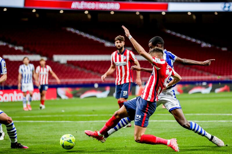 El Atlético había empeorado con sus sustituciones (Joao Felix por Correa, Kongdobia por Sául y Lodi por Suárez) y la Real, en cambio, se había agrandado con las suyas. La entrada del goleador Zubeldia, Merquelanz, Pacheco y Bautista dio ideas a la Real, que terminó arrinconando a los madrileños y obligándoles a pasarlo mal hasta el minuto 90. Cuando el colegio pitó el final, Simeone gritó desahogado. Partido a partido, y ya solo le quedan dos, el título le parece más cerca.