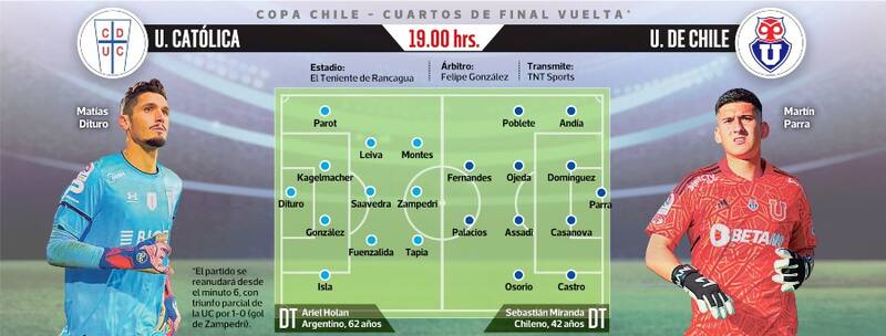 Esta tarde, la UC y la U completarán los 84 minutos restantes del historiado partido que debió suspendido por la bomba de ruido que le cayó a Martín Parra en Valparaíso, quien volverá a ser titular. En Rancagua, sin público y con la llave igualada, se definirá al último semifinalista de la Copa Chile.