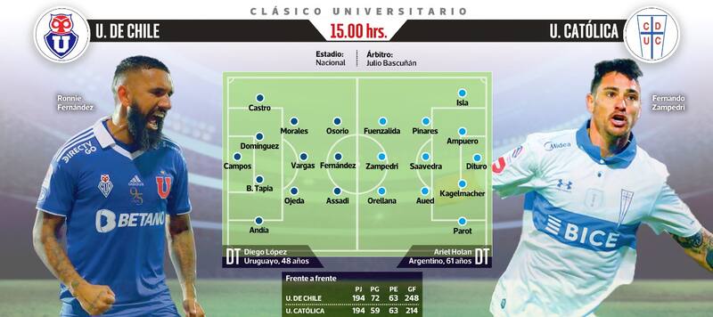 La U vuelve 535 días después a Ñuñoa para recibir a la UC. Ante 25 mil hinchas, los laicos pretenden hallar el camino para salir de la parte baja de la tabla. Los cruzados, aferrarse a la opción de clasificarse a copas internacionales.