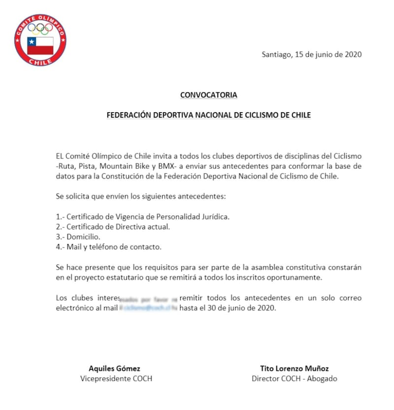 El Comité Olímpico de Chile envió este lunes un correro electrónico para crear una nueva federación. De acuerdo a la carta, el COCh invita a todos “los clubes deportivos de disciplinas del Ciclismo -Ruta, Pista, Mountain Bike y BMX- a enviar sus antecedentes para conformar la base de datos para la Constitución de la Federación Deportiva Nacional (FDN) de Ciclismo de Chile”.