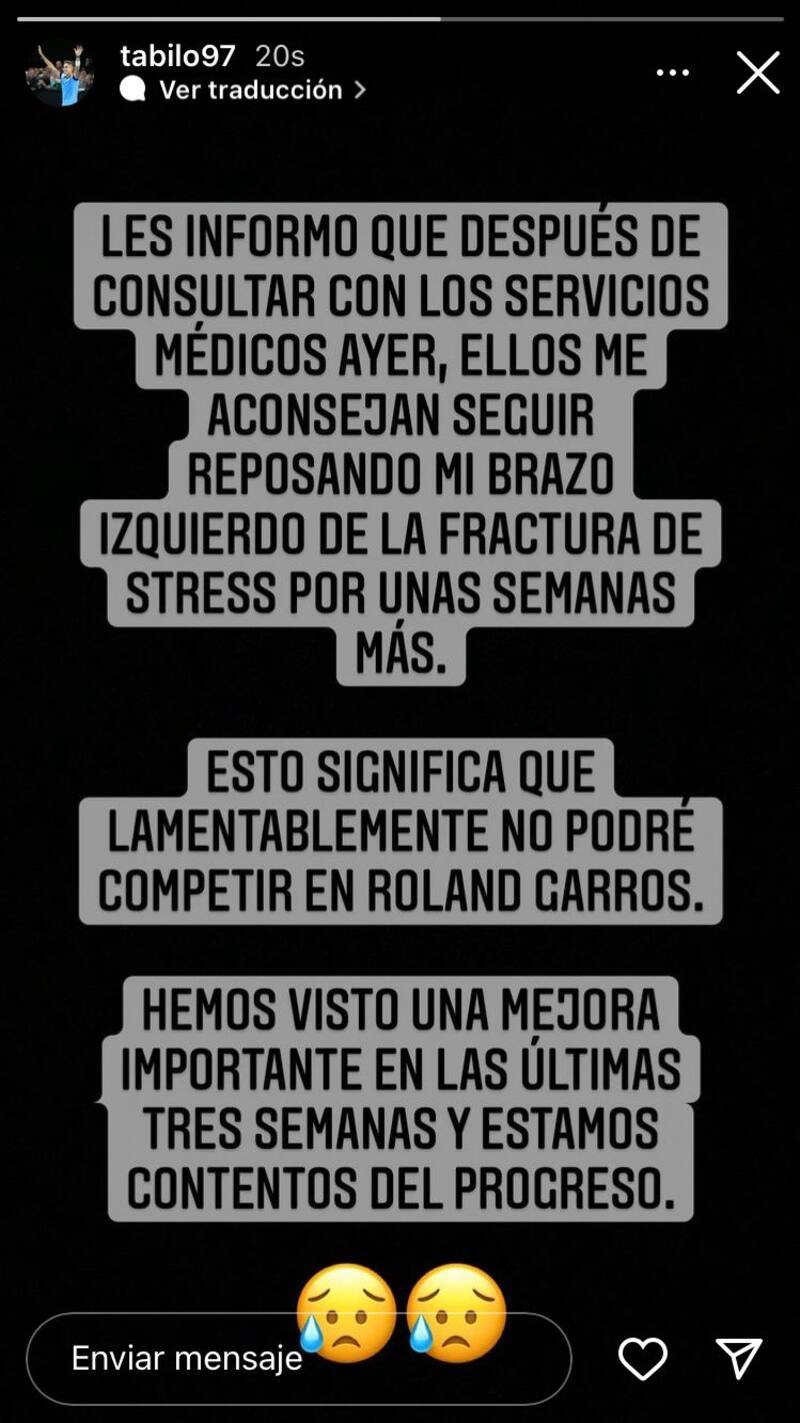 El zurdo informó que no estará en el Abierto de Francia para seguir recuperándose de una fractura por estrés. Iba a ser su primera vez en el main draw, luego de la apendicitis que le impidió jugar la qualy en 2020, misma instancia en la que, un año más tarde, quedó eliminado frente a Carlos Alcaraz, actual fenómeno del tenis mundial.