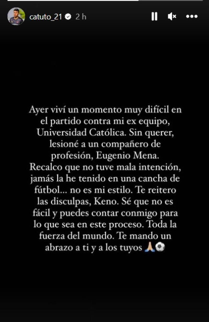 En el mismo sentido, ofrece excusas y apoyo al ex defensor de Santiago Wanderers, la U y Racing de Avellaneda. “Te reitero las disculpas, Keno. Sé que no es fácil y puedes contar conmigo para lo que sea en este proceso. Toda la fuerza del mundo. Te mando un abrazo a ti y a los tuyos”, puntualiza.