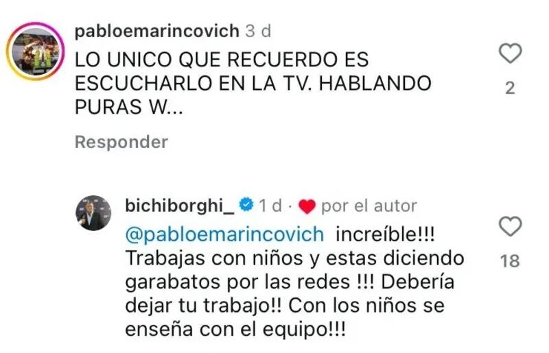 Contra todo pronóstico, el Bichi saltó a responderle. Y lo hizo en duros términos. Probablemente vio el perfil de quien lo atacaba, porque su respuesta apuntó al trabajo de quien le propinó la ofensa. “Increíble. Trabajas con niños y estás diciendo garabatos en las redes. Deberías dejar tu trabajo. Con los niños se enseña con el equipo”, fue el contraataque del campeón del mundo en México 1986.