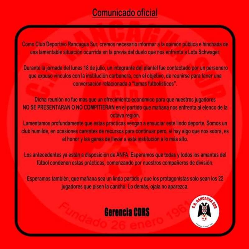 A través de un comunicado oficial, el CD Rancagua Sur evidenció la eventual irregularidad. “Durante la jornada del lunes 18 de julio, un integrante del plantel fue contactado por un personero que expuso vínculos con la institución carbonera (Lota), con el objetivo de reunirse para tener una conversación relacionada a “temas futbolísticos. Dicha reunión no fue más que un ofrecimiento económico para que nuestros jugadores NO SE PRESENTARAN O NO COMPITIERAN en el partido que mañana nos enfrenta al elenco de la octava región”, publicaron.