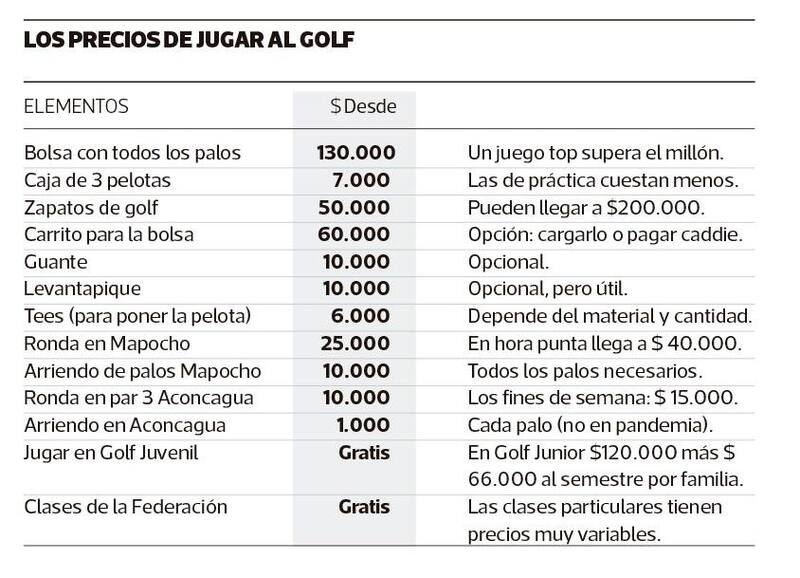 Sobre los palos, los precios han bajado mucho en los últimos años. Claro, tener la mejor tecnología, como en todos los deportes, puede ser carísimo ($ 800.000 por un solo palo), pero si la idea es comenzar y tener equipamiento propio, un juego completo, hasta con la bolsa, se puede encontrar por menos de $ 200 mil, el valor de una bicicleta promedio. A eso hay que sumarle pelotas, zapatos, tees...(ver cuadro).