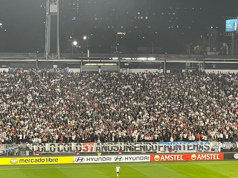 Ya con las acciones en marcha, al minuto 30, en el sector cordillera desplegaron un lienzo gigante que decía “Colo Colo 37 años uniendo fronteras”, con el escudo del elenco peruano al final.