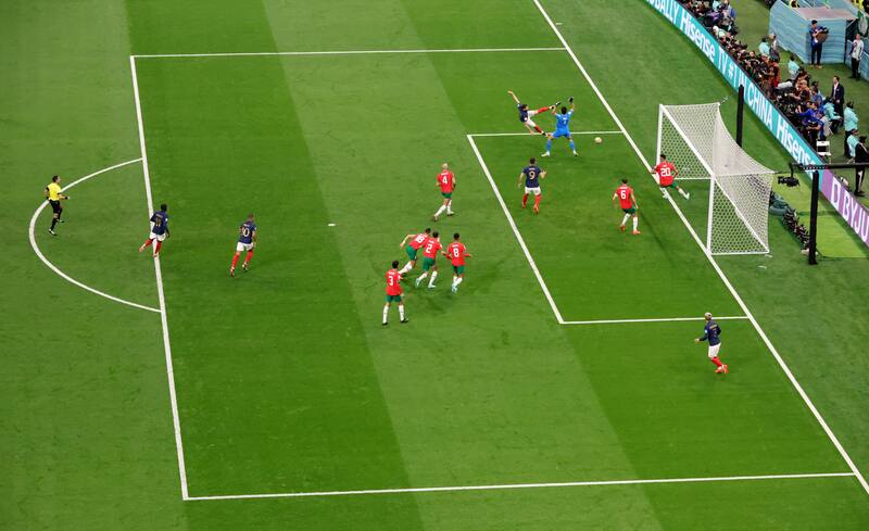 Didier Deschamps debió modificar su equipo ante las bajas obligadas de Upamecano y Rabiot. Entraron Konaté, en la defensa, y Fofana, en el medio. Por su parte, los Leones del Atlas eran locales en Al Khor, tanto así que sus efervescentes fanáticos pifiaron La Marsellesa en la entonación de los himnos. Para reforzar su fortaleza defensiva, el técnico Walid Regragui dispuso de un planteo conservador para iniciar el partido: 5-4-1. El devenir del encuentro hizo que el seleccionador tuviera que mover piezas y sacar a su escuadra del repliegue.