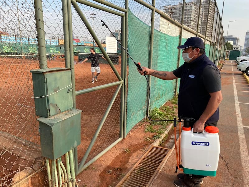 El Sport Francés, en Vitacura, abrió el jueves en marcha blanca. No había tenido ninguna actividad desde el 16 de marzo y trabajan con los pocos funcionarios que viven en zonas de transición. De hecho, como cancheros del tenis están los profesores y en la entrada en funciones de portero está el gerente de mantención. Desde los estacionamientos todo está señalado, amonio cuaternario en los limpiapiés, con entrada y salida diferenciada, para tenis y para golf, el resto de los deportes sigue cerrado. “La práctica, para tirar pelotas, está cerrada y se dispusieron las salidas cada 15 minutos para que no haya más de 10 personas en el mismo hoyo”, cuenta Sebastián Vicuña, gerente general del club.