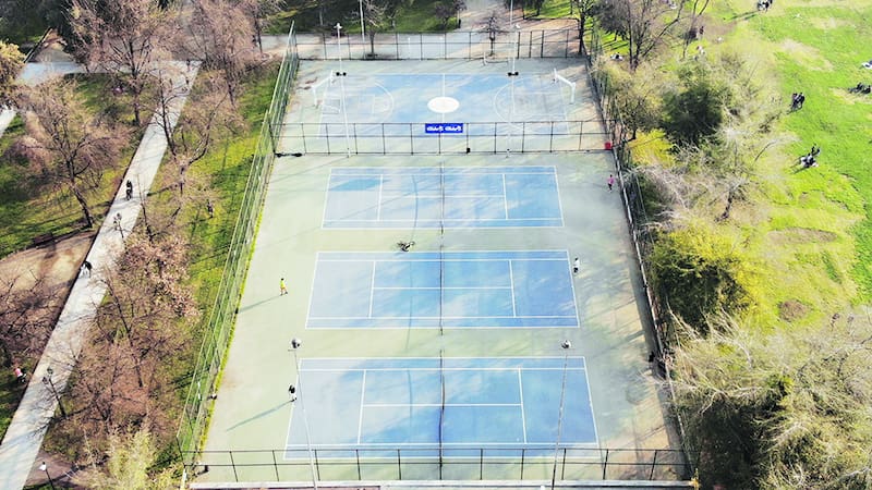Las canchas públicas del Parque Araucano son otra de las que ya abrieron. La fase 2 en la que está Las Condes permitió que desde el jueves los vecinos pudieran reservar horas. Son las 17 horas y las canchas lucen completas, con dos singlistas en cada una. Mientras familias hacen picnics, juegan en bancos de arena o sobre el pasto, sin mantener mucha distancia, la jaula que encierra las canchas parece la zona más segura de todo el parque. “El Ministerio dio la autorización para jugar solo singles, así que vamos a funcionar de lunes a viernes desde las 9 de la mañana hasta las 20 horas. Las inscripciones se abren a las 18 horas en la página de la Municipalidad”, dice Carlos Iglesias, director del Departamento de Deportes de Las Condes.
