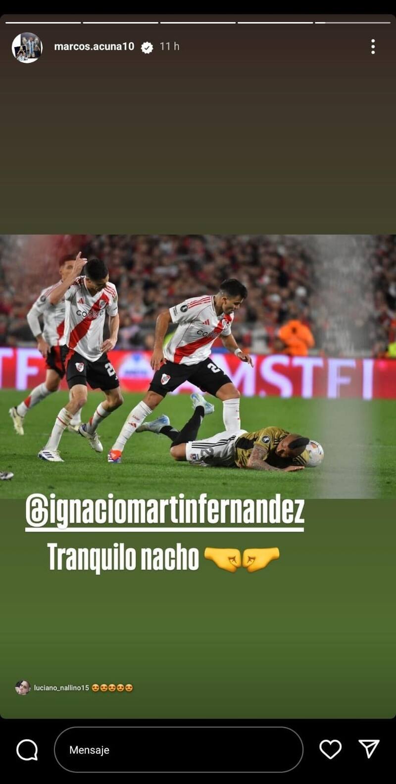 Nada de esto ha gustado en Buenos Aires. La prensa transandina arremete contra el Rey. Y ahora lo hacen sus colegas. En sus redes sociales, el Huevo Acuña continuó con los dardos a Vidal. Subió una historia de Instagram donde se puede ver una fotografía del histórico futbolista en el suelo. En la imagen, Ignacio Fernández y el lateral están de pie. “Tranquilo, Nacho”, escribió el marcador de punta.
