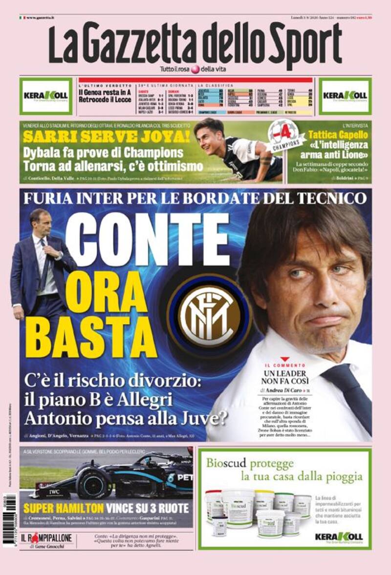 La portada de este lunes de La Gazzetta dello Sport da cuenta del conflicto entre el entrenador y la cúpula, dentro de la que se incluye al director deportivo Giuseppe Marotta, con quien Conte trabajó en la Juventus.