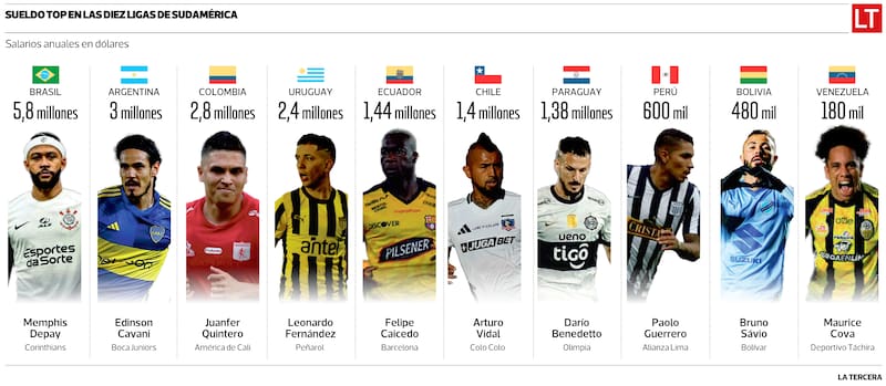El salario de Arturo Vidal, el más alto de la Liga de Primera, es poco más de un cuarto de lo que recibe el neerlandés Memphis Depay en Corinthians de Brasil, el mayor ingreso entre todos los países que forman la Conmebol. Son cinco las naciones que superan al torneo local en ese registro.