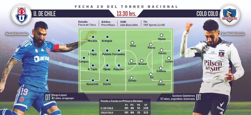 Colo Colo, líder del Campeonato Nacional, tiene 18 puntos más que Universidad de Chile antes del duelo en Talca. Ventaja solo comparable con las 19 unidades que llevaban albos sobre azules en el Apertura 2007.