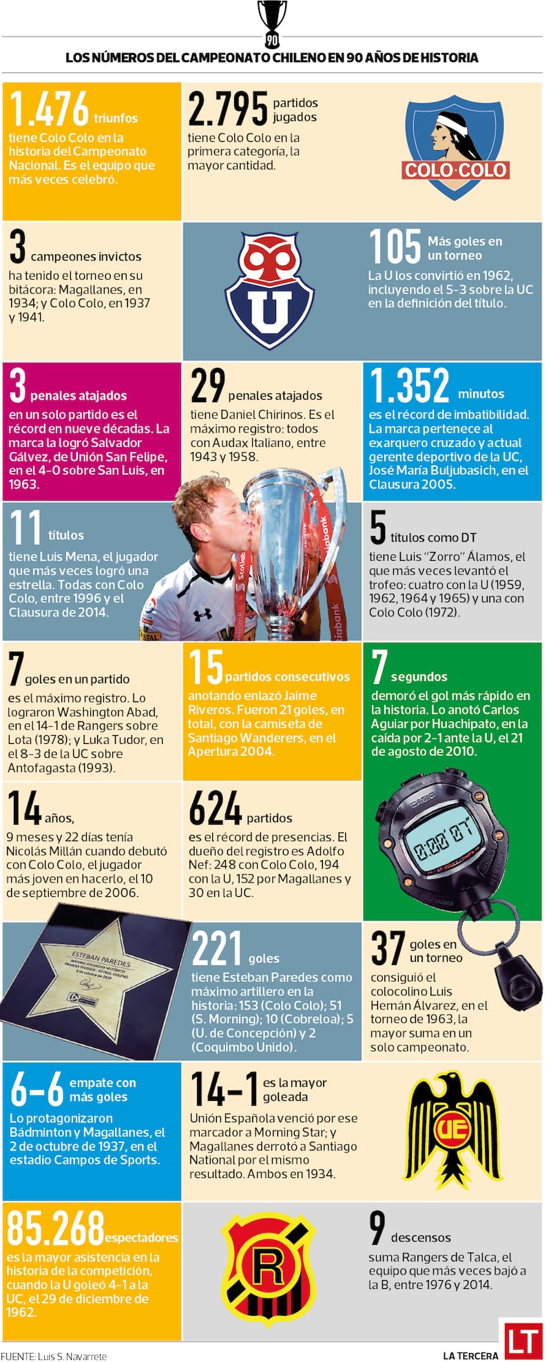 Universidad de Chile, el segundo equipo con más títulos (18) en el palmarés, tiene logros importantes en estos 90 años de fútbol chileno. De partida, es el cuadro que más goles anotó en una sola temporada, con 105 tantos en 1962. Una campaña redonda, porque ese mismo año coprotagonizaron la mayor asistencia de público en la historia del torneo, cuando 85.268 personas vieron el 4-1 sobre la UC, aquel 29 de diciembre.