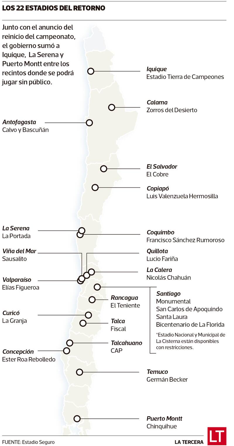 Después de 155 días de suspensión, el fútbol chileno por fin tiene una fecha oficial de regreso: el sábado 29 de agosto. El encargado del anuncio fue el Presidente de la República, Sebastián Piñera, quien en el Estadio Nacional confirmó el retorno del torneo, acompañado por Pablo Milad, timonel de la ANFP; Cecilia Pérez, ministra del Deporte, y los capitanes de los equipos de la Región Metropolitana, entre ellos Esteban Paredes (Colo Colo), José Pedro Fuenzalida (la UC) y Matías Rodríguez (la U).