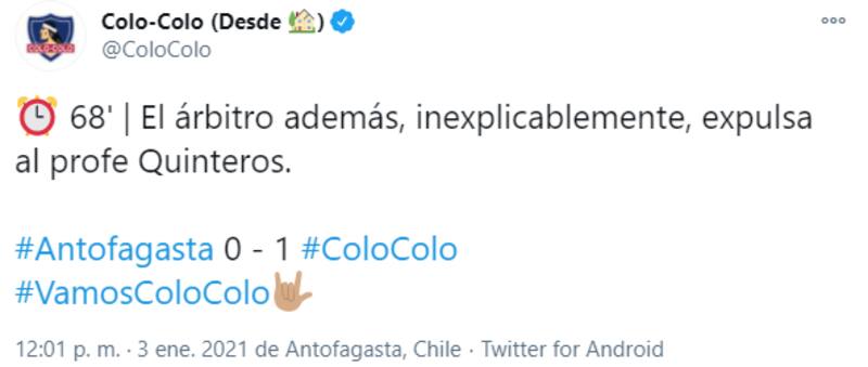 Algo que llamó la atención fue la promulgación del club en redes sociales, catalogando como inexplicable la expulsión del DT. De inmediato, llovieron las críticas de hinchas hacia el técnico y la institución.