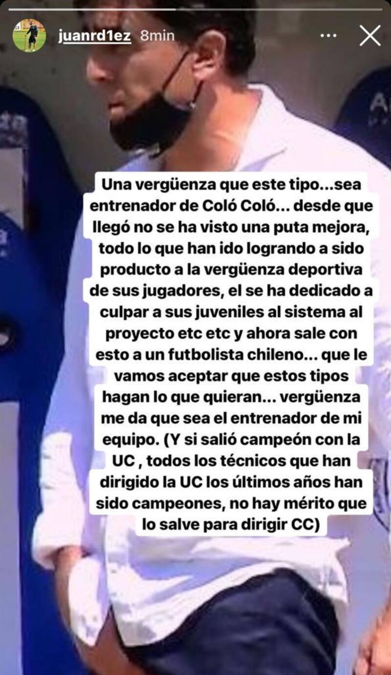 La situación también despertó la ira de Juan Ramírez, PF de Arturo Vidal y expreparador físico en el periodo de Héctor Tapia. El profesional cuestionó con dureza la actitud de Quinteros, expresando que “es una vergüenza” que dirija al club.