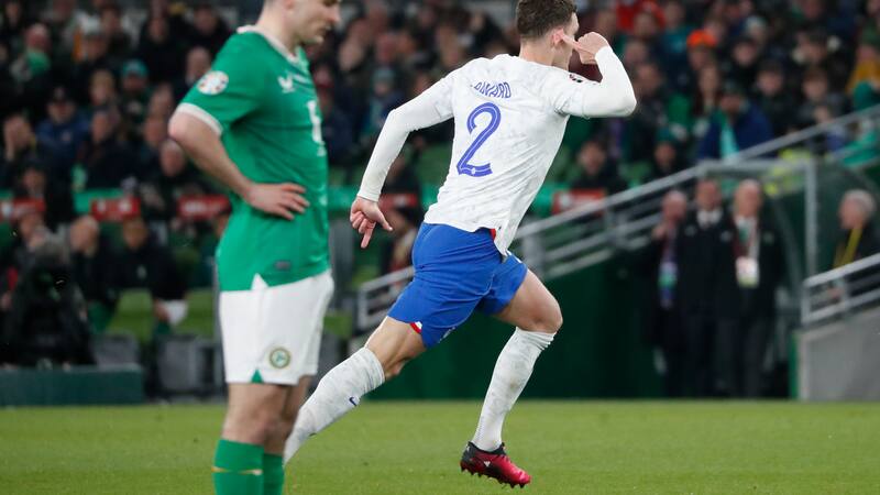 A los 50 minutos, John Egan intentó salir por el medio y perdió la pelota ante el lateral Benjamin Pavard, quien quedó frente al arco y remató con fuerza al arco para abrir el marcador en el Aviva Stadium.