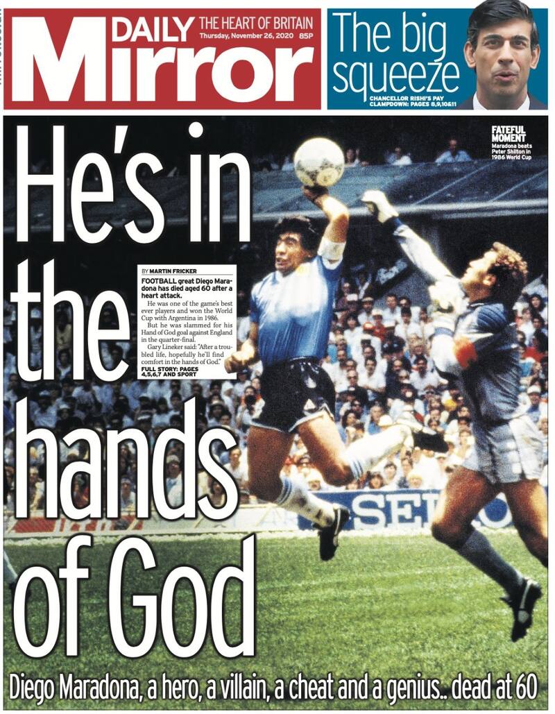 Se trata de una figura mundial, que no deja indiferente a nadie. Por lo mismo, los medios deportivos del mundo coparon sus portadas con el fallecimiento del Diez. En particular, los diarios ingleses recordaron la famosa Mano de Dios. Aquí, un repaso.