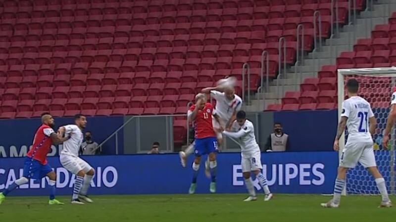 El delantero paraguayo Carlos González se eleva en área propia y despeja el balón. Los jugadores chilenos reclaman mano. El más efusivo es Arturo Vidal, quien levanta las manos, le advierte al juez colombiano Wilmar Roldán y lanza la pelota fuera del campo de juego para forzar la revisión por parte del VAR. El árbitro del encuentro se concentra en el audífono por el que se comunica con el VOR, la cabina que administra el videoarbitraje. Seguramente por indicación de sus colaboradores, opta por realizar la ya icónica señal del monitor y va al centro de la cancha. Para pesar de los intereses de la Roja, mantiene la decisión. No hubo tiro desde los doce pasos para Chile.