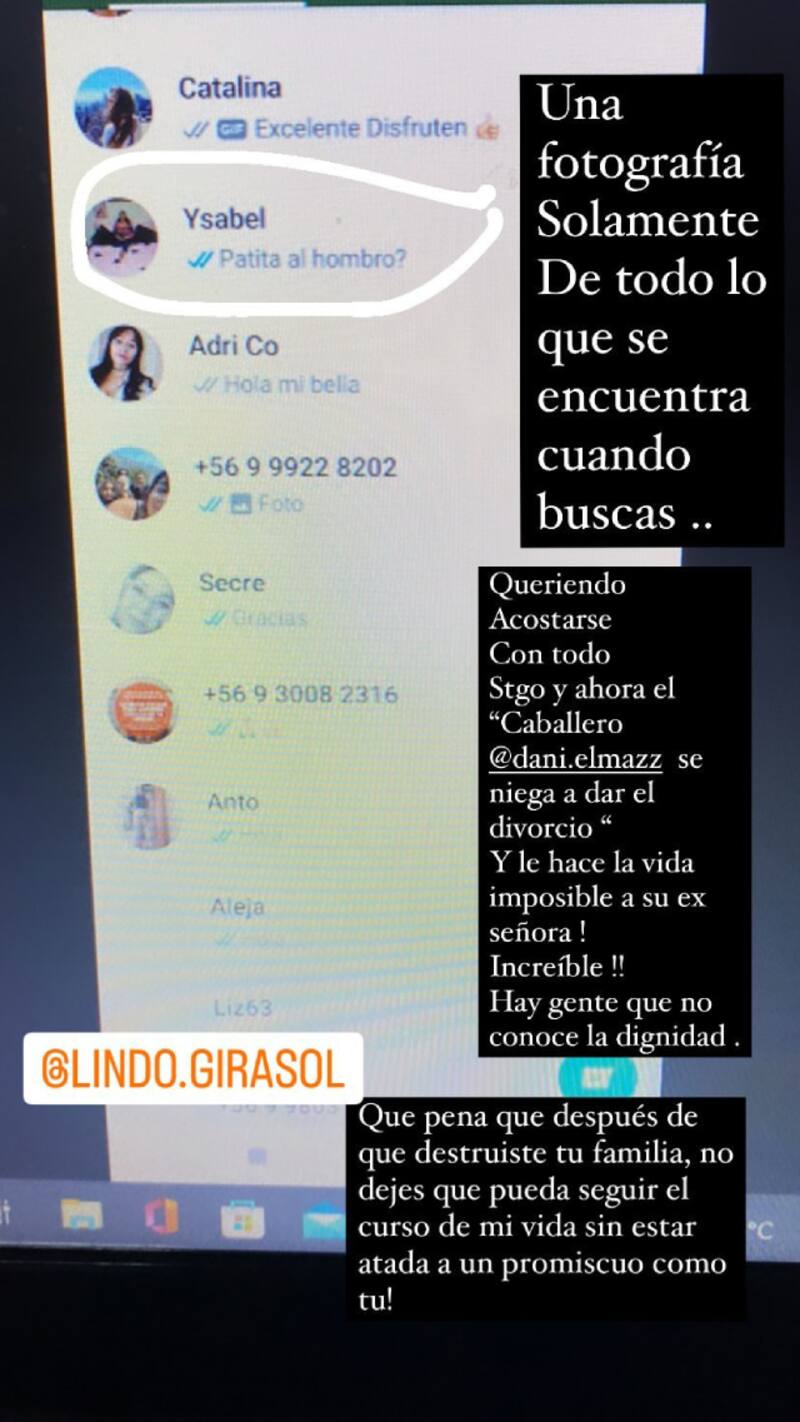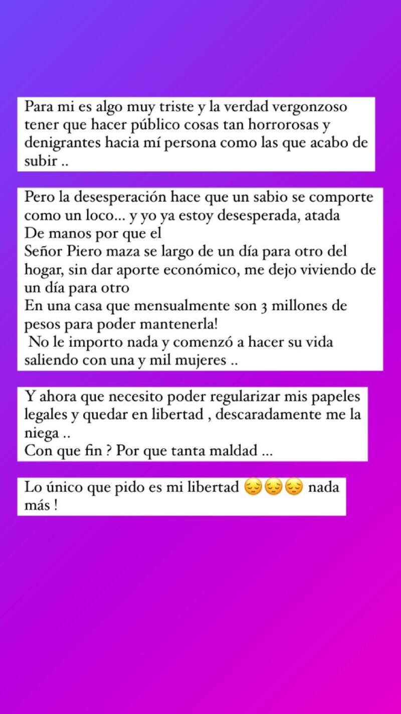 Luego, en una nueva historia, agregó que “Para mí es algo muy triste y la verdad vergonzoso tener que hacer público cosas tan horrorosas y denigrantes hacia mi persona como las que acabo de subir, pero la desesperación hace que un sabio se comporte como un loco... y yo ya estoy desesperada, atada de manos”.