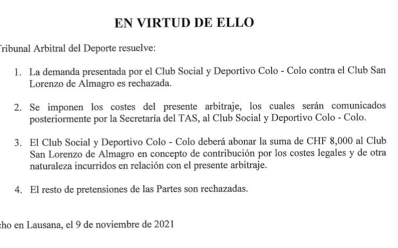 “La demanda presentada por el Club Social y Deportivo Colo Colo contra el Club San Lorenzo de Almagro es rechazada”, consigna el veredicto, en su primer punto. El segundo, condena a los albos a pagar las costas del arbitraje y el tercero a abonarle a San Lorenzo casi siete millones de pesos chilenos (ocho mil francos suizos, la moneda de referencia que utiliza el tribunal) a cuenta de los costos vinculados con la diligencia.