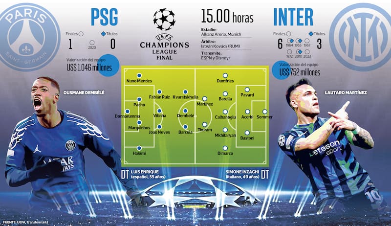 Esta tarde, en Múnich, franceses e italianos definen al monarca de la Champions. De la mano de Luis Enrique, el campeón galo se reconstruyó tras la salida de sus máximas estrellas. Mientras que los lombardos consolidaron su lugar en la elite mundial gracias a Simone Inzaghi y una gran regularidad. Un choque de elencos de autor.