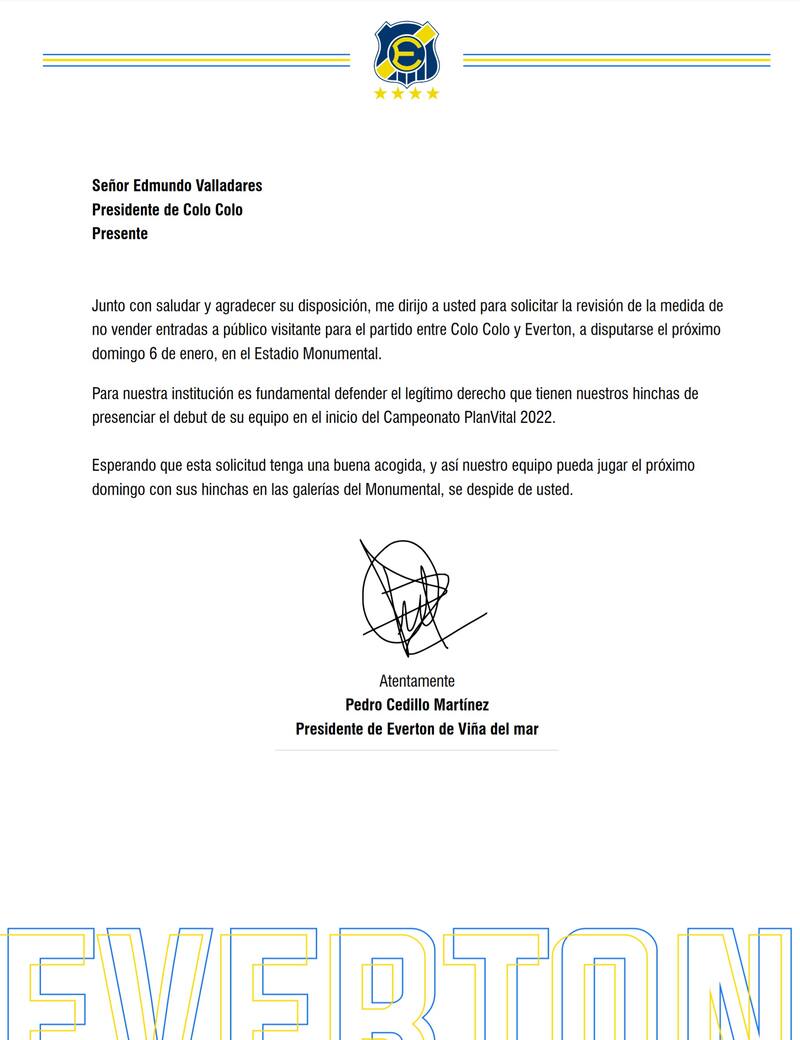 “Para nuestra institución es fundamental defender el legítimo derecho que tienen nuestros hinchas de presenciar el debut de su equipo en el inicio del Campeonato PlanVital 2022″, expresa el segundo párrafo del escrito firmado por Pedro Cedillo, presidente de Everton, luego de que Colo Colo pusiera a disposición solo entradas para los fanáticos locales.
