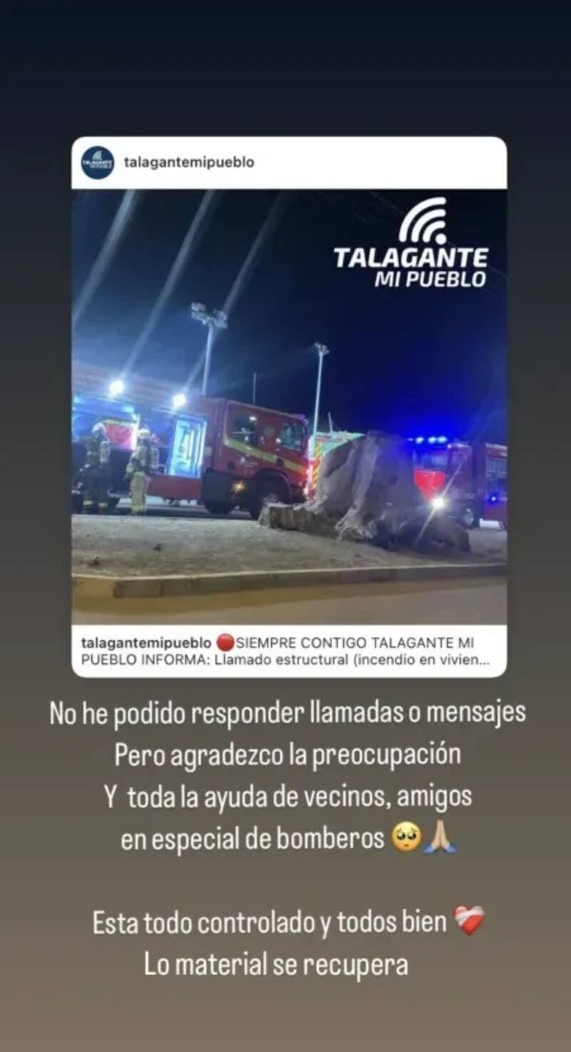 “No he podido responder llamadas o mensajes, pero agradezco la preocupación y toda la ayuda de vecinos, amigos y en especial de Bomberos”, agrega. De acuerdo a la información expuesta por el medio local Talagante Mi Pueblo, el incendió inició en el entretecho y habría sido causado por una estufa salamandra.