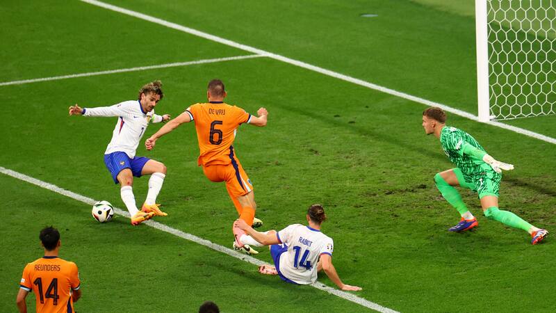 Antes del minuto, llegó la primera emoción. Un pase en profundidad de Memphis encontró a Frimpong picando. Su remate cruzado y algo mordido fue sacado por el arquero Maignan. De vuelta, a los 4′, los galos respondieron con un tremendo disparo de Antoine Griezmann que fue magistralmente sacado por el meta Verbruggen.
