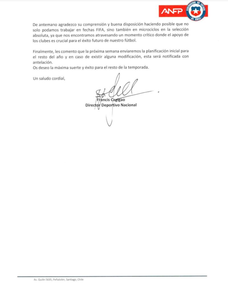 “Requerimos vuestra constante colaboración para lograr la cohesión y progresión de nuestras Selecciones sub 20 y sub 17, en un importante período, que se proyecta de mucho trabajo de construcción para el futuro”, complementó.