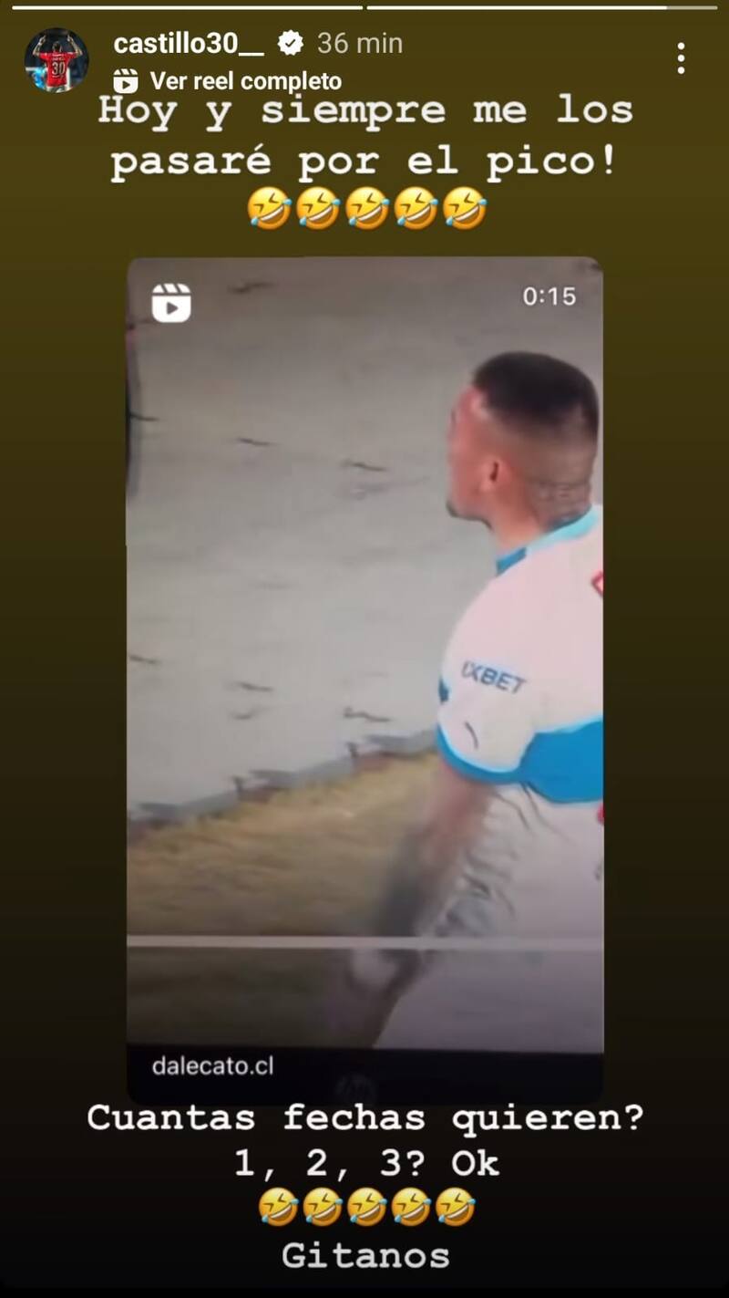 Castillo, que fue el primero de los jugadores en abandonar el recinto deportivo de Ñuñoa, continuó mostrando su animadversión contra Universidad de Chile después de lo sucedido en la cancha.