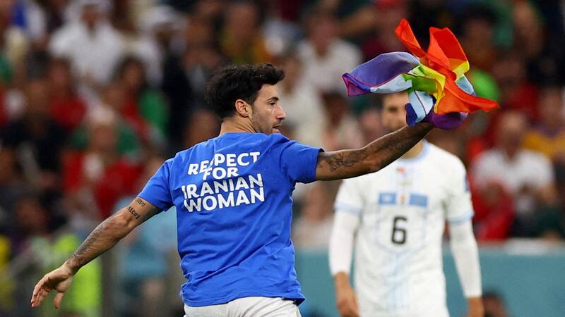 En el minuto 50 del encuentro un hincha saltó a la cancha portando una bandera arcoíris, además de portar una camiseta con dos mensajes: “Salvar a Ucrania” y “respeto para las mujeres iraníes”.
