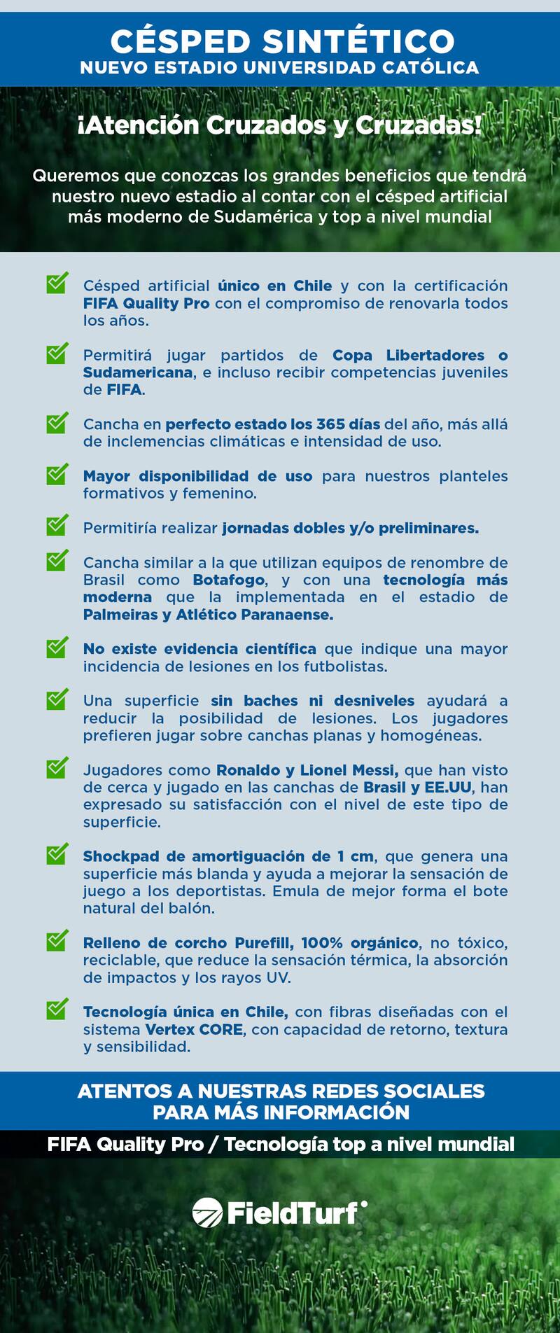 La UC mantiene a sus socios e hinchas informados respecto de los avances en la construcción del nuevo recinto. En el caso específico del campo de juego, el club de Las Condes les hizo llegar a sus afiliados una imagen que contiene una extensa descripción de las virtudes de la superficie que eligió para la parte más importante del proyecto que los dotará de un moderno reducto.