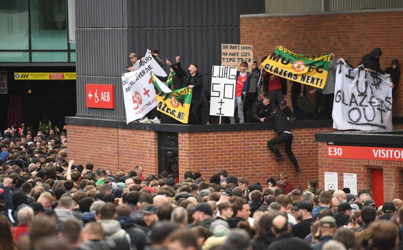 Cientos de hinchas ingresaron al estadio portando pancartas pidiendo la salida de la familia Glazer, dueña de la institución. Las manifestaciones obligaron a suspender el clásico contra el Liverpool.