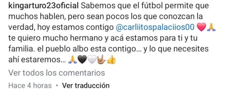Sin embargo, a pesar de la ola de críticas, desde la vereda del Cacique salieron a respaldarlo. Arturo Vidal, en su rol de líder vocal del equipo albo, posteó un mensaje de apoyo para su compañero. “Sabemos que el fútbol permite que muchos hablen, pero sean pocos los que conozcan la verdad, hoy estamos contigo Carlitos Palacios. Te quiero mucho hermano y acá estaremos para ti y tu familia. El pueblo albo está contigo y lo que necesites ahí estaremos”, reza el texto.