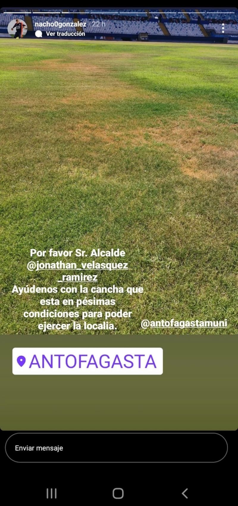El panorama actual del césped del estadio también fue expuesto por González a través de sus redes sociales. En la imagen se puede observar que el presente estado imposibilita el desarrollo de un partido en condiciones óptimas. En su publicación, el jugador incluso le pide ayuda al alcalde de Antofagasta, Jonathan Velásquez.