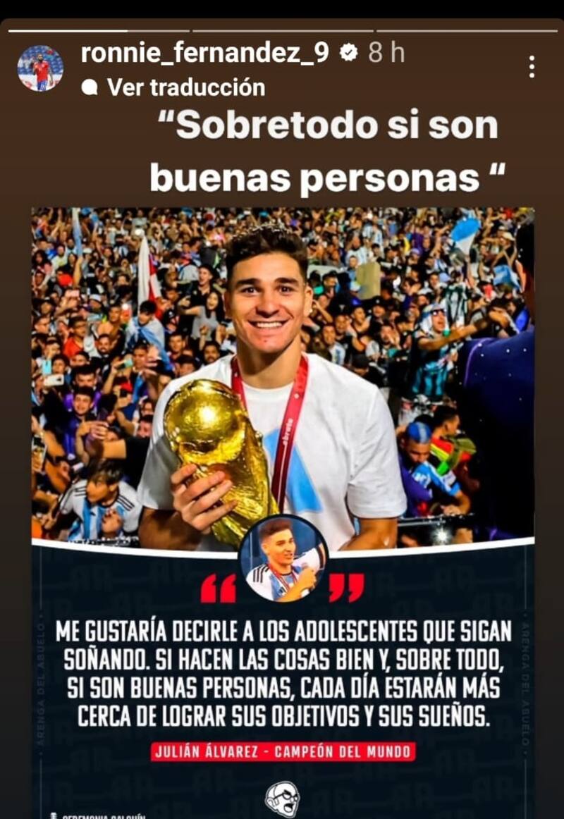Por eso no es casualidad que justo en el momento en que se conoce que fue marginado de los entrenamientos tácticos de la U, decisión que tomó el técnico Mauricio Pellegrino y que también involucra a otros compañeros, el delantero use su cuenta de Instagram (@ronnie_fernandez_9) para postear un nueva historia.