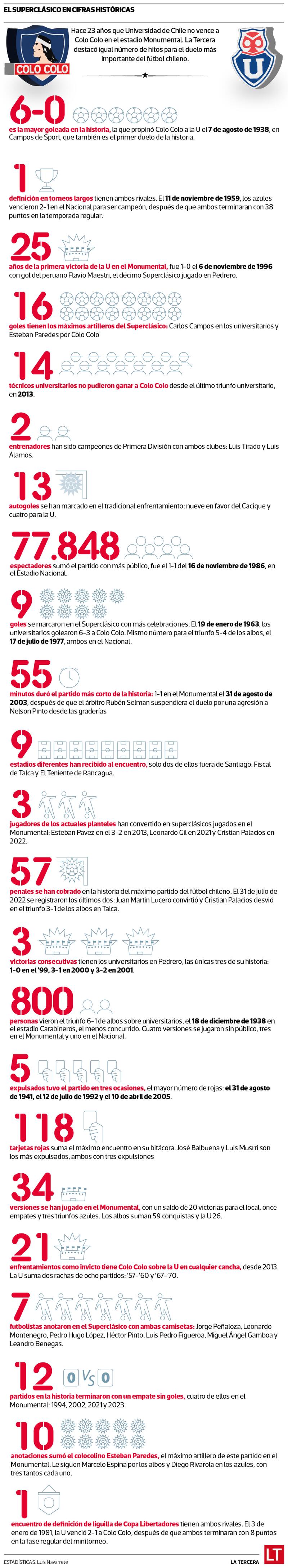 Este domingo, los elencos más populares del país se reencuentran en el estadio Monumental, sitio en el cual los azules no ganan desde hace 23 años. Por ello, La Tercera expone 23 datos que marcan la historia de este partido.