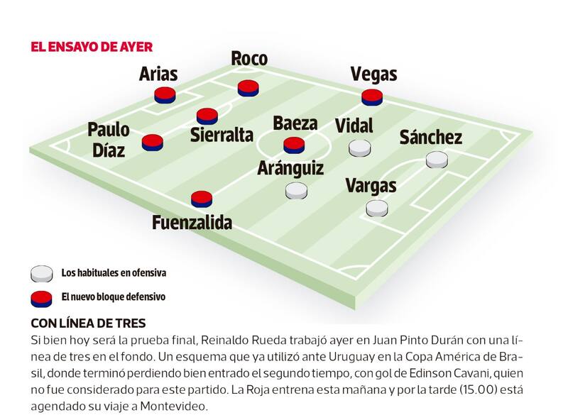 En la práctica de ayer, Rei probó una defensa de tres con Paulo Díaz, Sierralta y Roco, sumando a Fuenzalida y Vegas como extremos en el mediocampo. Si bien hoy desde la 9.00 la Selección tiene su última práctica en Santiago, el esquema testeado ayer es similar al que ya ocupó Rueda en la Copa América 2019 ante el combinado charrúa.