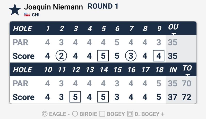Pasó lo primero. Obviamente, la organización puso la cancha para ser vencida y hubiera movilidad en el tablero. Así pasó con casi todos, no con Joaquín Niemann, quien entregó una tarjeta de 72 golpes, dos sobre el par del campo. El chileno anotó dos birdies y cuatro bogeys y esta es su tarjeta: