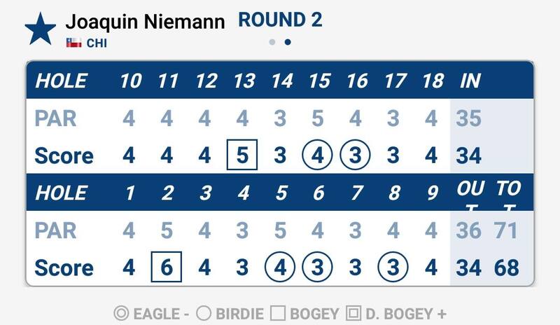 Cuando la ronda se suspendió, Joaquín Niemann había jugado el hoyo 17 y había anotado birdies en tres de sus cuatro últimos hoyos. Esa seguidilla fue clave, pues después pudo cerrar el día con par en el 18, para ponerse 45, con -7 (ver tarjeta), y salvar el corte, una situación que, antes de la racha, parecía complicada.