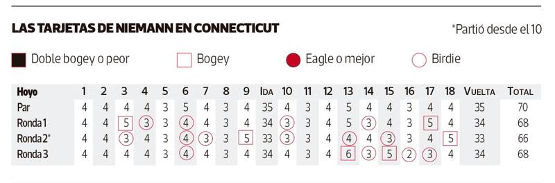 Al final del día, Niemann casi no se movió: era 26º y terminó 27º, con -8 (ver tabla). Este domingo cerrará desde las 11.55 junto al coreano Si Woo Kim.